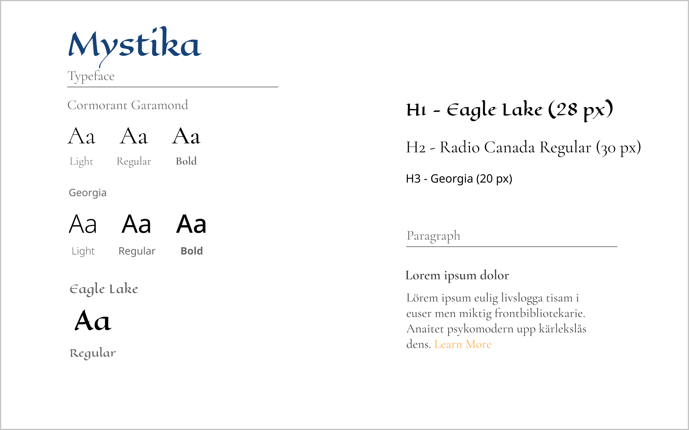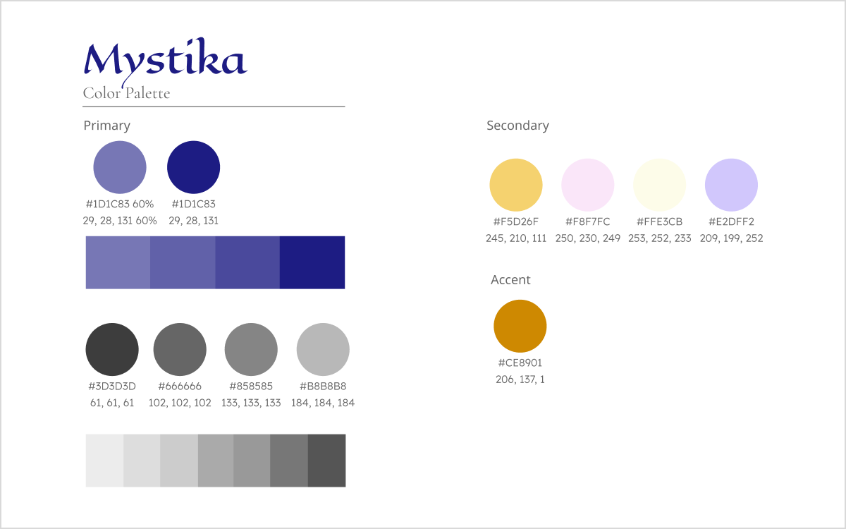 Mystika's typographic system layers four complementary families: Cormorant Garamond for elegant display headings, Eagle Lake for brand marks and decorative accents, Inter for clean interface text, and Lora for immersive reading content.