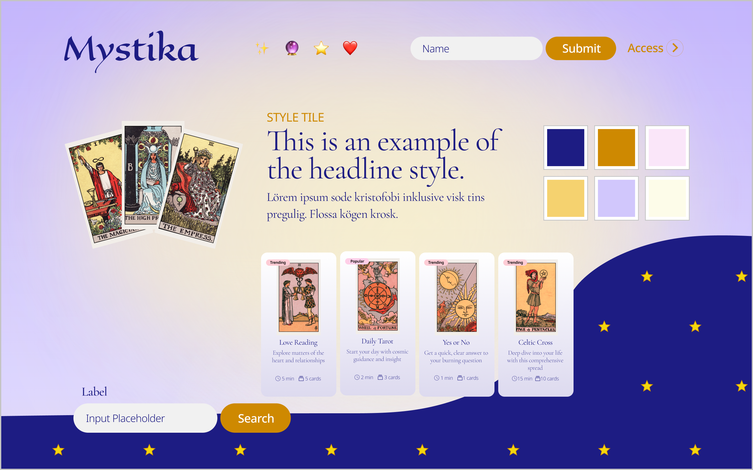 Deep indigo paired with rich gold forms the brand's core identity — evoking mysticism, trust and premium quality. Element-based colour coding (fire, earth, air, water) extends the palette across tarot spreads and zodiac content.